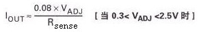 調(diào)節(jié)針可通過外置的直流電壓(VADJ)進行過驅(qū)動,以獲得超過內(nèi)置的電壓基準(zhǔn),并調(diào)整輸出電流使其超出或低于額定值。此時的額定輸出電流為: